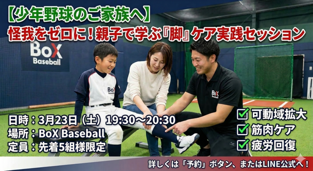 野球のパフォーマンス向上と怪我予防の要となる「脚(下半身)」に特化した、親子実践型コンディショニングセッションを開催します!