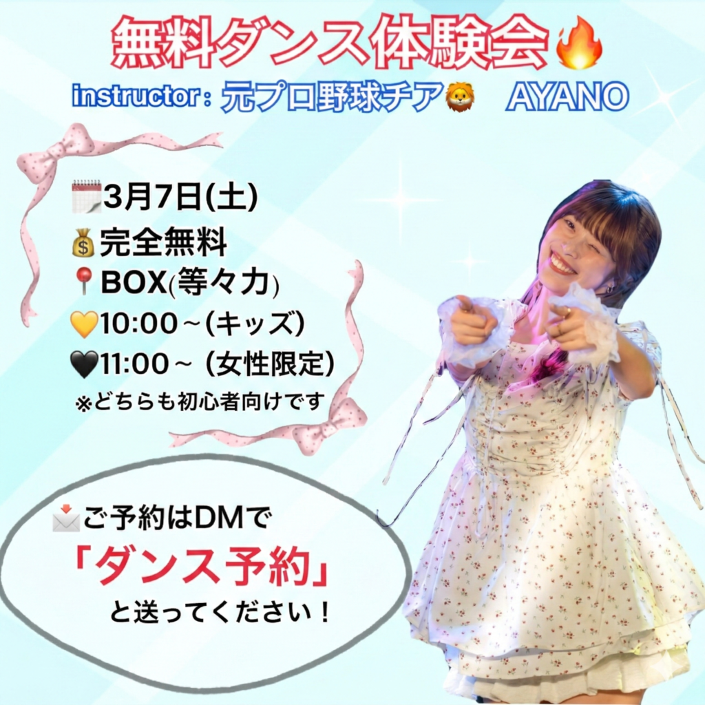 【無料ダンス体験会】3/7(土)開催!元プロ野球公式パフォーマーAYANOが世田谷・等々力にやってくる!